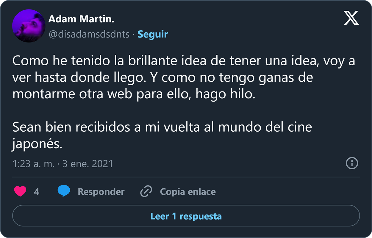 Sean bien recibidos a mi vuelta al mundo del cine japonés.